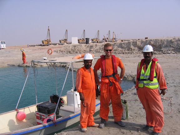 Après une nuit au Al Diar Dana Hotel, j'ai pris la route vers Ruwais, située à 200 km à l'ouest d'Abu Dhabi avec ma Nissan Altima 2.5l (300 km avec un plein seulement). Le projet sur lequel je travaillais était la phase préliminaire à la pose d'un gazoduc, faire une tranchée. Celle-ci doit relier la côte au niveau du lieu-dit "Ras Al Qila" jusqu'à une Ile située à 100 km au large, Das Island où se trouve une raffinerie et des terminaux pour les gaziers. Sur une dizaine de kilomètres, à proximité des côtes, le niveau d'eau est très bas et l'amplitude de la marée dans le golfe Persique n'excède guère 1 m. Pour les levés bathymétriques, j'ai donc utilisé un petit canot avec le sondeur monofaisceau installé en sein même de la coque pour éviter de l'endommager.